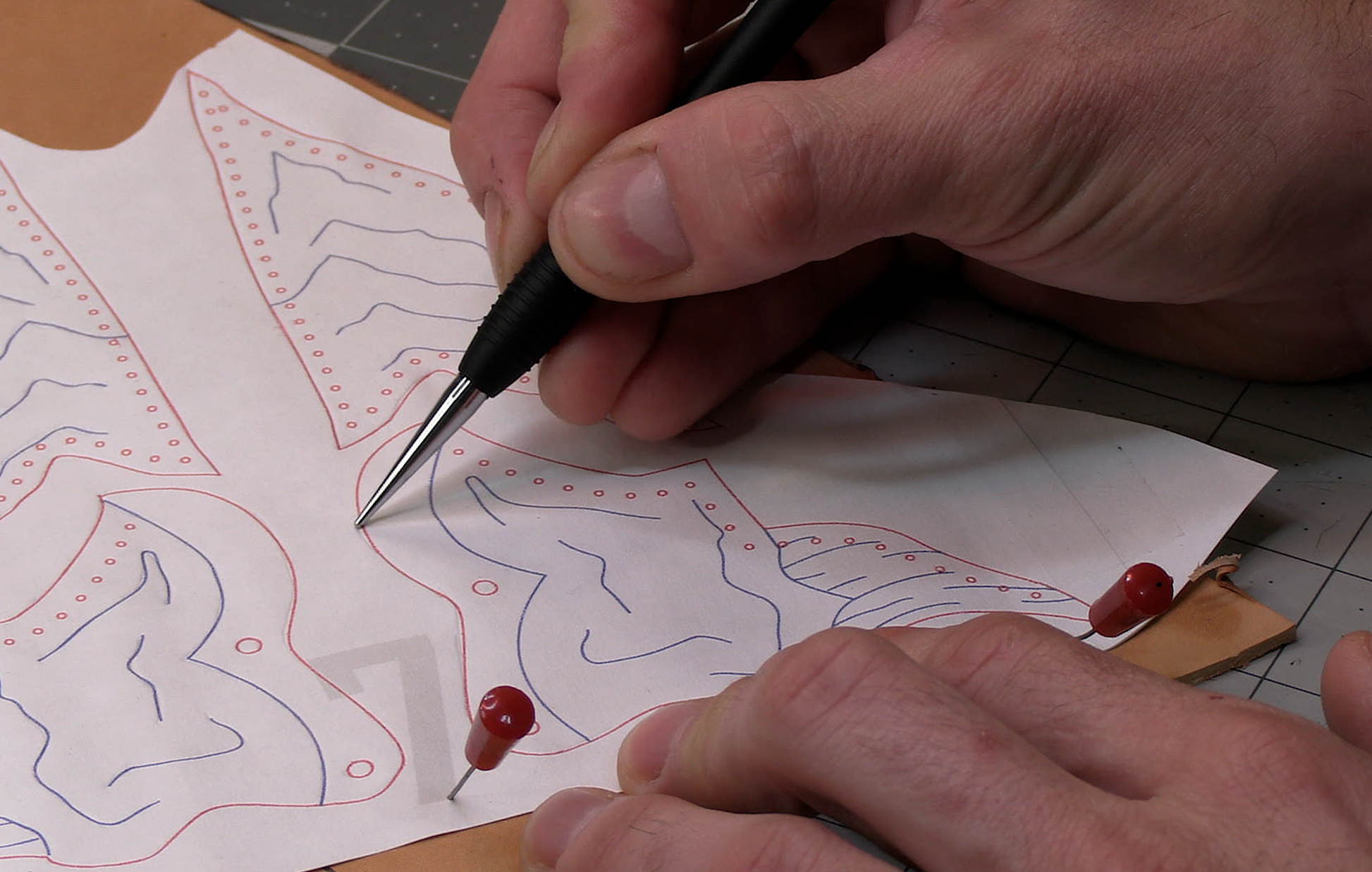 Vegetable-tanned cowhide (4–6 oz), printer paper (waterproof or laminated), Scotch tape, scissors or cutting wheel, leather shears, utility/craft knife, pins or tape, ball stylus, swivel blade, modeling spoon, (optional) edge beveler or sandpaper, maul/hammer, punch or stitching forks, waxed thread, needle, rivets + setter, spray bottle or sponge, large pot (6–12 qt),  tongs, (optional) mannequin head, leather dye or paint with brushes.